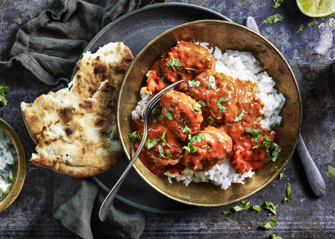Sett på risen til oppkok og følg fremgangsmåte på pakningen med ferdig tikka masala-saus. La det koke opp og senk varmen. Ha i kjøttkakene og la de småkoke i 10 min i sausen.